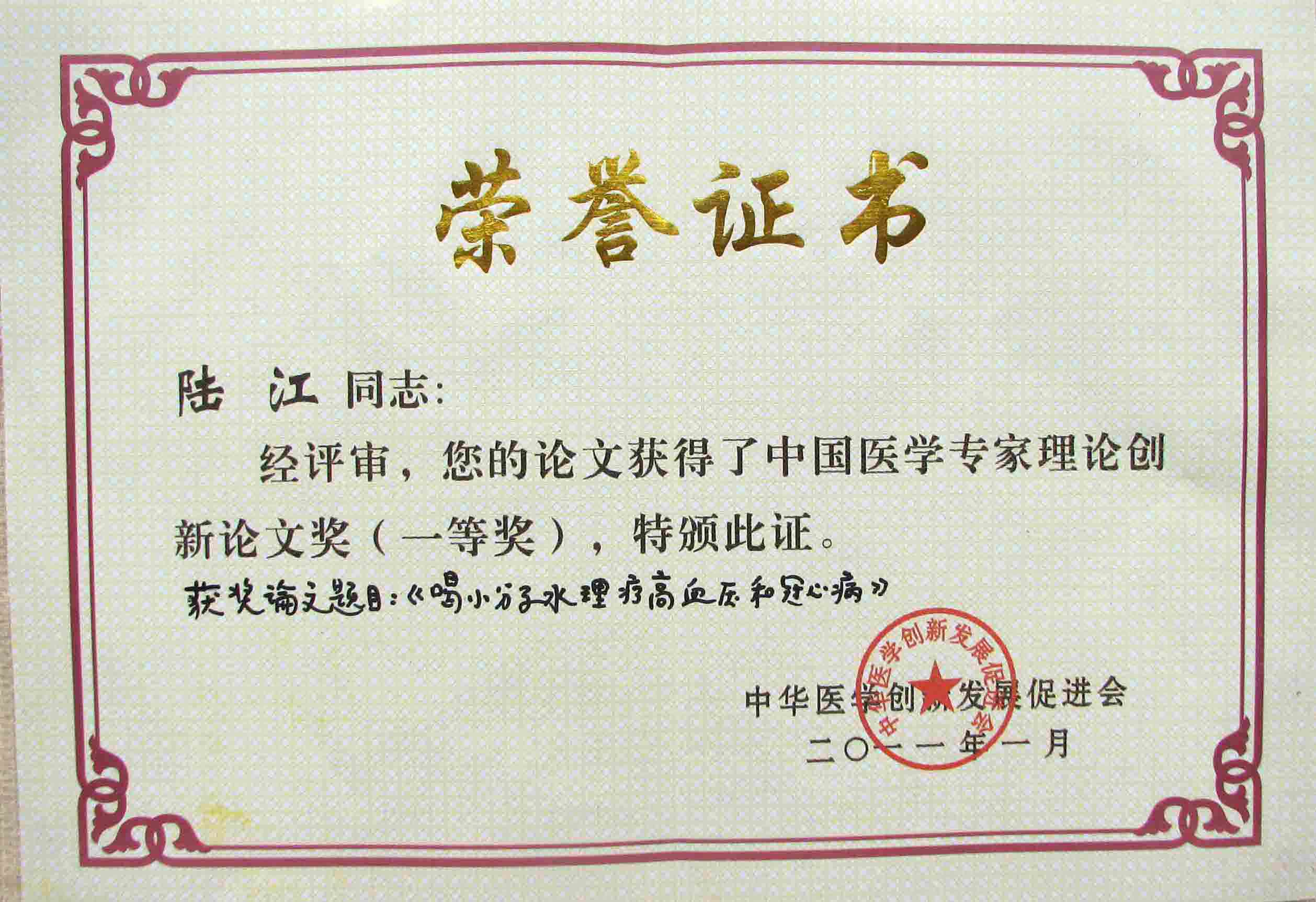 一.發明的亮點是中國基礎醫學研究成果的轉化醫學應用------------------------------------------------------------------------------------ 1990年春,我50歲,發現患了高血壓,便及時遵醫囑服藥。我想起父輩、祖輩曾患高血壓,后來都患中風癱瘓或心梗過世,所以心中壓力大。我夢想能根治高血壓,便研究醫學。當我檢索到中國基礎醫學研究成果,采用高脂餐和磁處理小分子團水飼喂小白鼠或大白免等兩組哺乳動物,經過2、4、6個月剖殺血檢,發現飼喂小分子團水的試驗組動脈內壁干凈,能減輕和延緩動脈粥樣硬化。我從這些研究成果受到啟發。覺得有責任研制出優良的器具,讓天下人能真正治愈高血壓,消除動脈粥樣硬化,延年益壽。于是,1990年我做成樣品,先后與愛人飲用兩三個月,分別治愈了高、低血壓,之后我們的血壓都正常,癥狀消失。該水經南京大學做核磁共振檢測為55.82赫茲的微小分子團水。該品經工業開發后,1994年送給廣西三家三甲醫院做臨床試用4個月,再經北京和廣西醫學專家鑒定認為:“降脂降壓效果好” ,“能擴大心腦動脈流量,改善心腦電圖和微循環” ,“對治療心腦動脈粥樣硬化、高血壓、高血脂有良好的醫療保健作用”。1996年產品獲得中國發明專利權。這就使產品可以轉化為醫學應用,人類可逐漸改變終生服藥,自己祛除病癥。